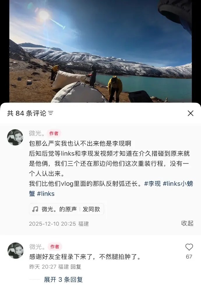 事情发生在12月初的西藏山南。李现素颜出镜,满脸胡茬,背着20公斤重装,啃着自热米饭对抗高原反应,正和同伴艰难前行。有路人好奇搭讪:“你们是博主吗?”他笑着回应:“算是吧,我只有35个粉丝。”这话一出,网友立刻翻旧账——此前他受访时说自己有49个粉丝,如今又缩水了,被调侃“薛定谔的粉丝数”,成了新梗。更戏剧性的是临别一问:“你叫李现吗?”他秒摆手:“不叫!认错了!”转头还跟同伴吐槽对方“反射弧太长”,语气里全是藏不住的得意和狡黠。可讽刺的是,他越是否认,越暴露得彻底——湖北口音一开口,标志性鼻梁一露,再加上肩上那台哈苏专业相机,网友直呼:“这否认了个寂寞!”